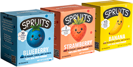 Spruits are fruit powders and Spreggies are vegetable powders, both made from 100% freeze-dried produce. They're designed to make it easier for parents to add fruits and veggies to kids' meals without the hassle of prep work. Each powder is minimally processed to retain its natural color, flavor, and nutritional value.