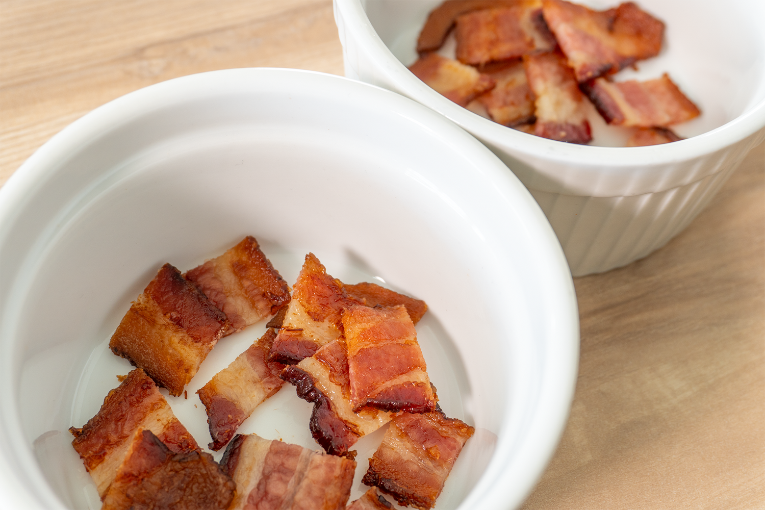 Preheat the oven to 350°F (175°C). Cook the bacon using your preferred method. For crispy, brittle bacon, bake it in the oven at 350°F (175°C) for about 20 minutes. Once cooked, chop it into small pieces.