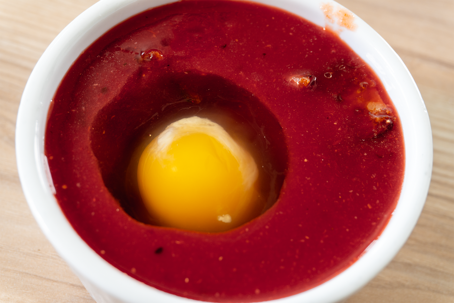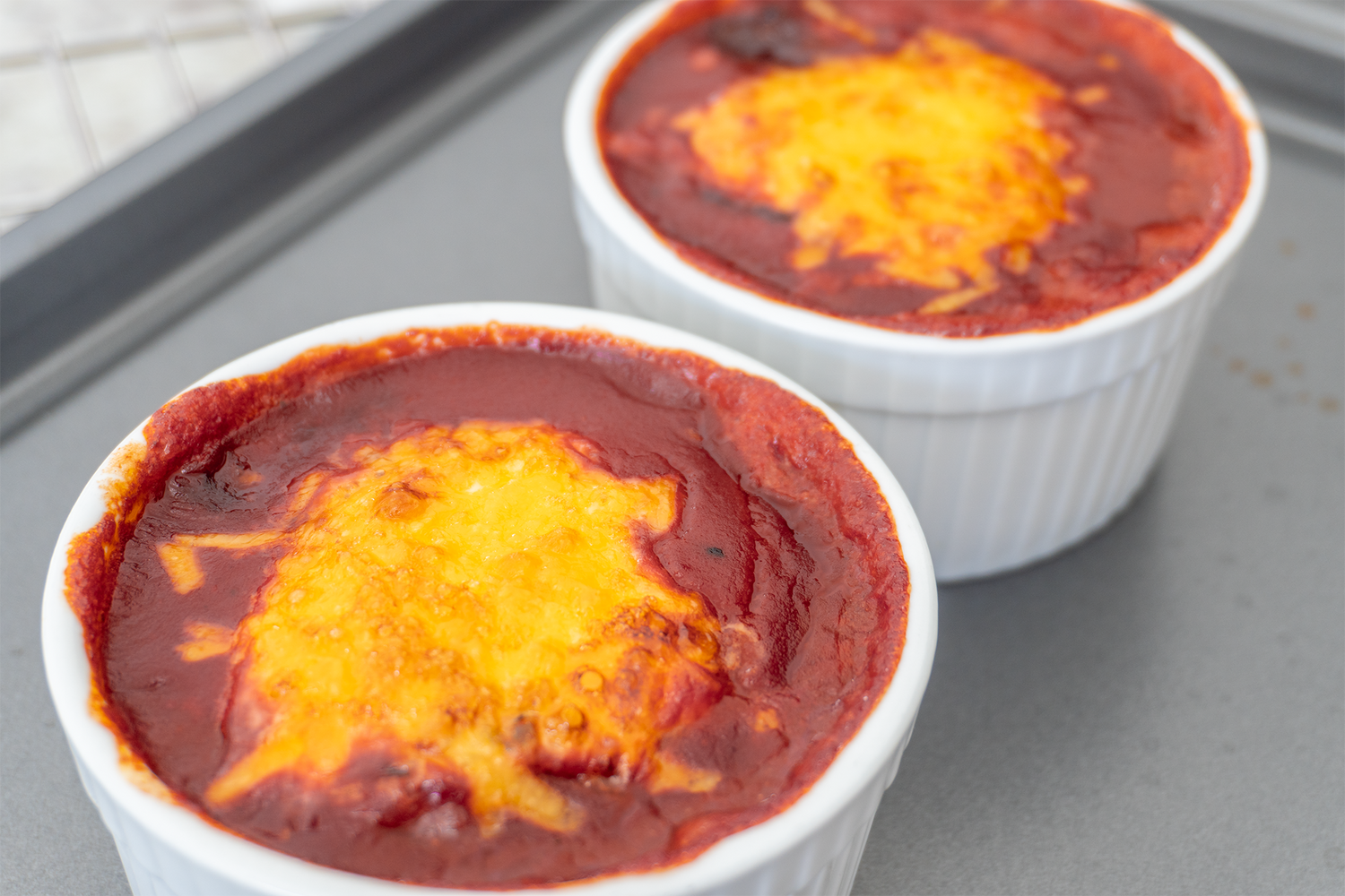 Divide the chopped bacon between two 4-ounce ramekins (or use any oven-safe dish, adjusting portions as needed). Pour enough tomato sauce into each ramekin to cover the bacon while leaving space for the egg and cheese.