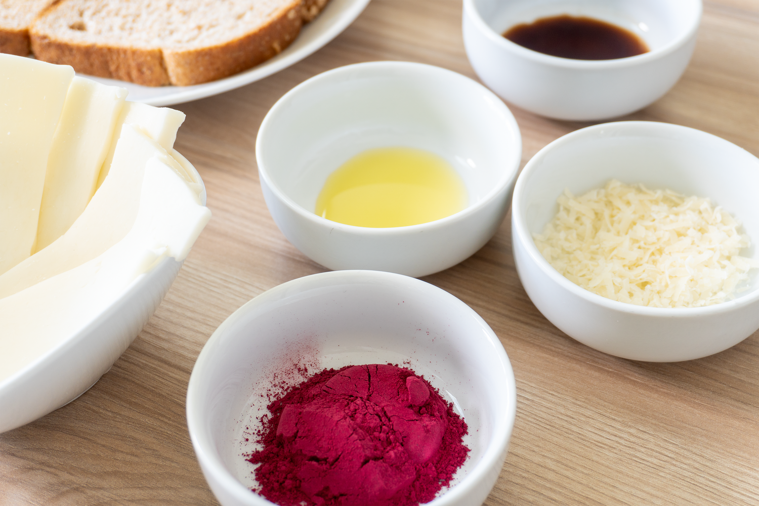 In a small bowl, mix 1 tablespoon Beet Spreggies, 1 tablespoon balsamic vinegar, 1/2 tablespoon olive oil, and 1/2 tablespoon water. Adjust as needed to form a spreadable paste—add more liquid if it’s too thick or more beet powder if it’s too runny. The balsamic flavor will seem strong at first but will mellow once combined with the cheese.