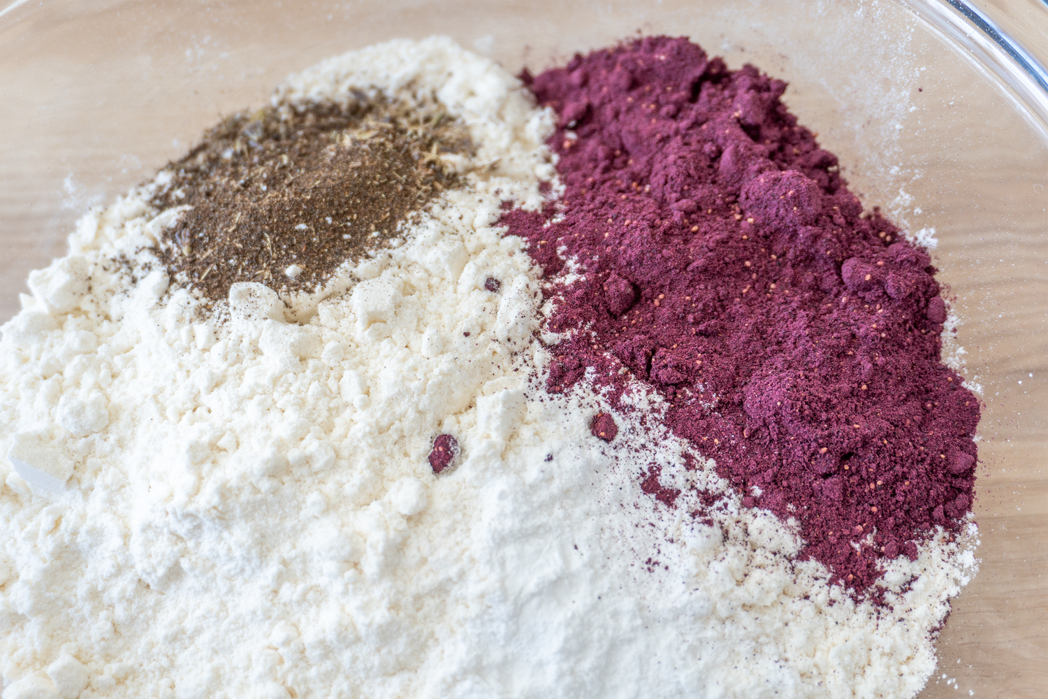 In a separate bowl, whisk together 1 1/4 cups flour, the ground tea and lavender, 1 teaspoon baking powder, 1/4 teaspoon salt, and 1 tablespoon Blueberry Spruits. This will help evenly distribute the flavors before mixing into the wet ingredients.