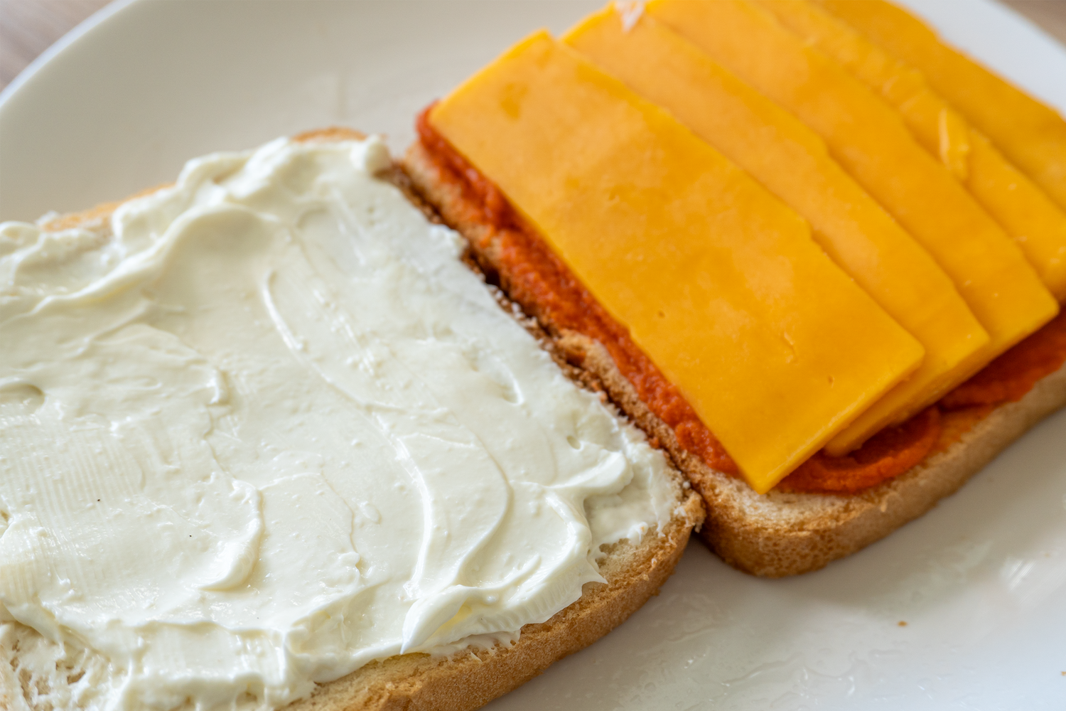 Spread the carrot-celery mixture evenly over the unbrushed side of one slice of bread. On the other slice, spread 2 tablespoons of cream cheese, then layer cheddar cheese slices over the top, making sure to cover the surface. Press the two slices together with the fillings inside.