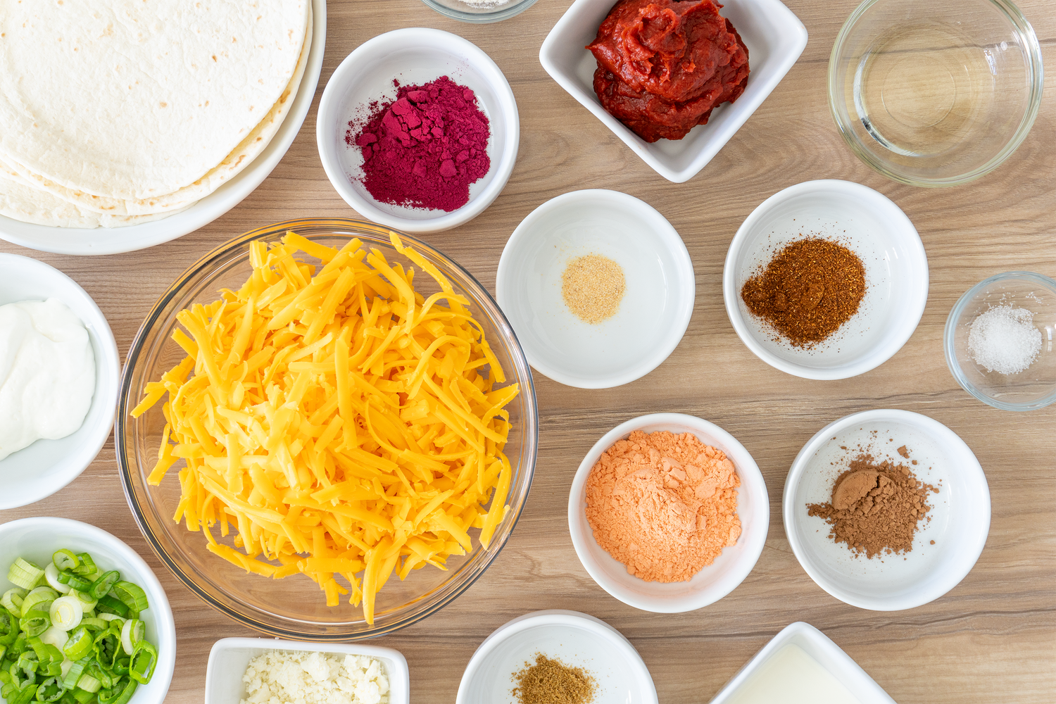 In a container with a lid, add 3-4 cups shredded cheddar cheese and 2 tablespoons Carrot Spreggies. Drizzle with a little vegetable oil, close the lid, and shake to coat the cheese evenly. This helps prevent the cheese from drying out while baking. Alternatively, mix the Carrot Spreggies with 2 tablespoons of water to form a paste and spread it onto each tortilla before adding the cheese.