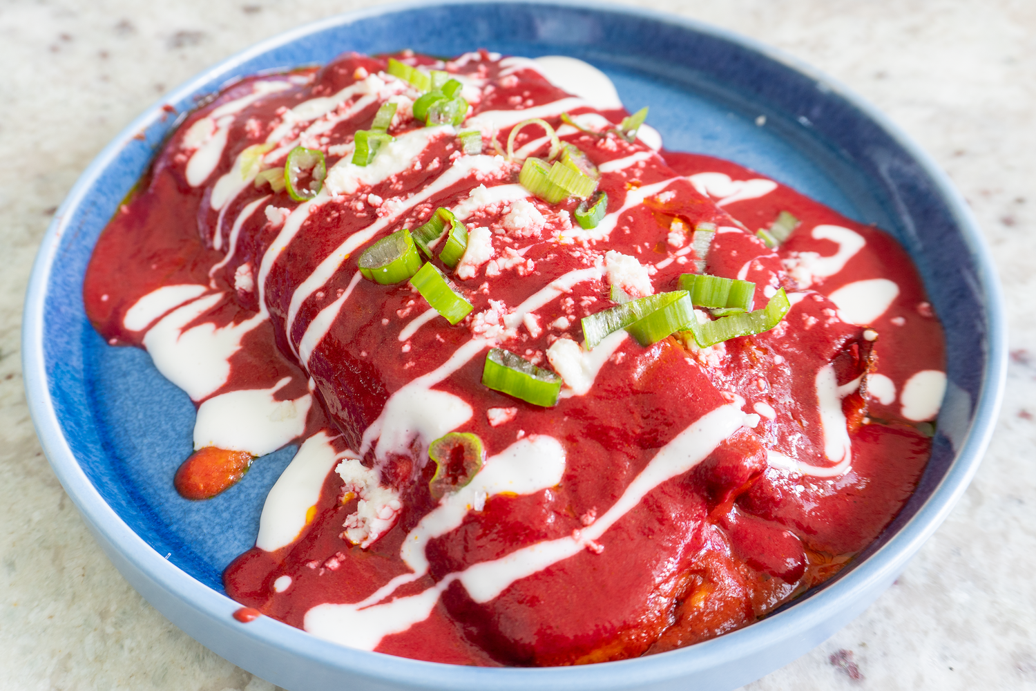 Once out of the oven, top the enchiladas with 2 tablespoons cotija cheese, 2 tablespoons Mexican sour cream, and 1 diced green onion. Serve warm and enjoy!