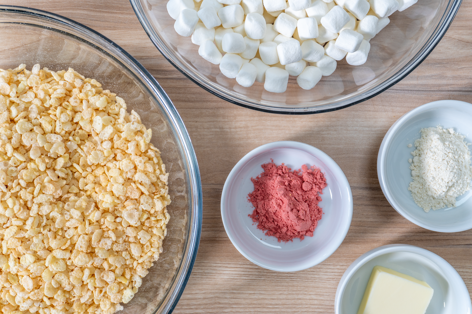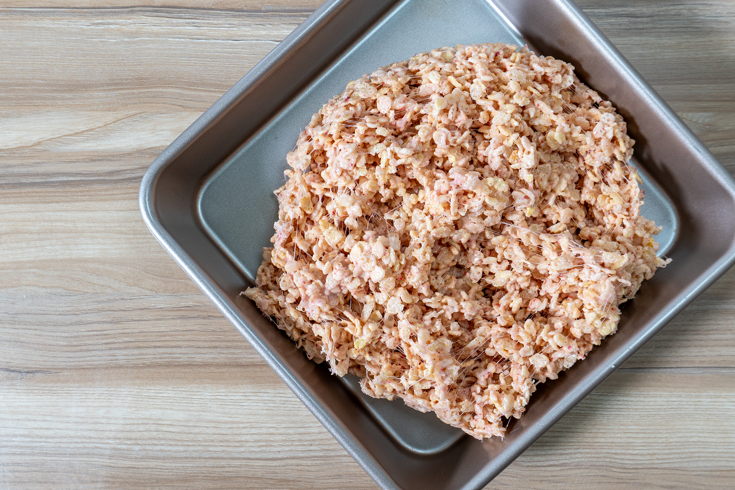 Transfer the mixture into an 8x8 baking pan. Use a spatula to press it down evenly, ensuring the treats are about 1 inch thick.