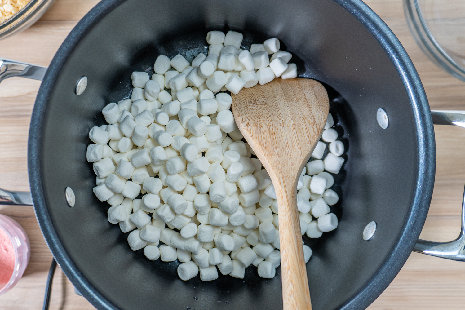 In a large non-stick pot, melt the butter over low heat. Add the marshmallows, stirring constantly, and allow them to melt completely. Be careful to avoid burning—watch for slight browning but do not let them scorch.