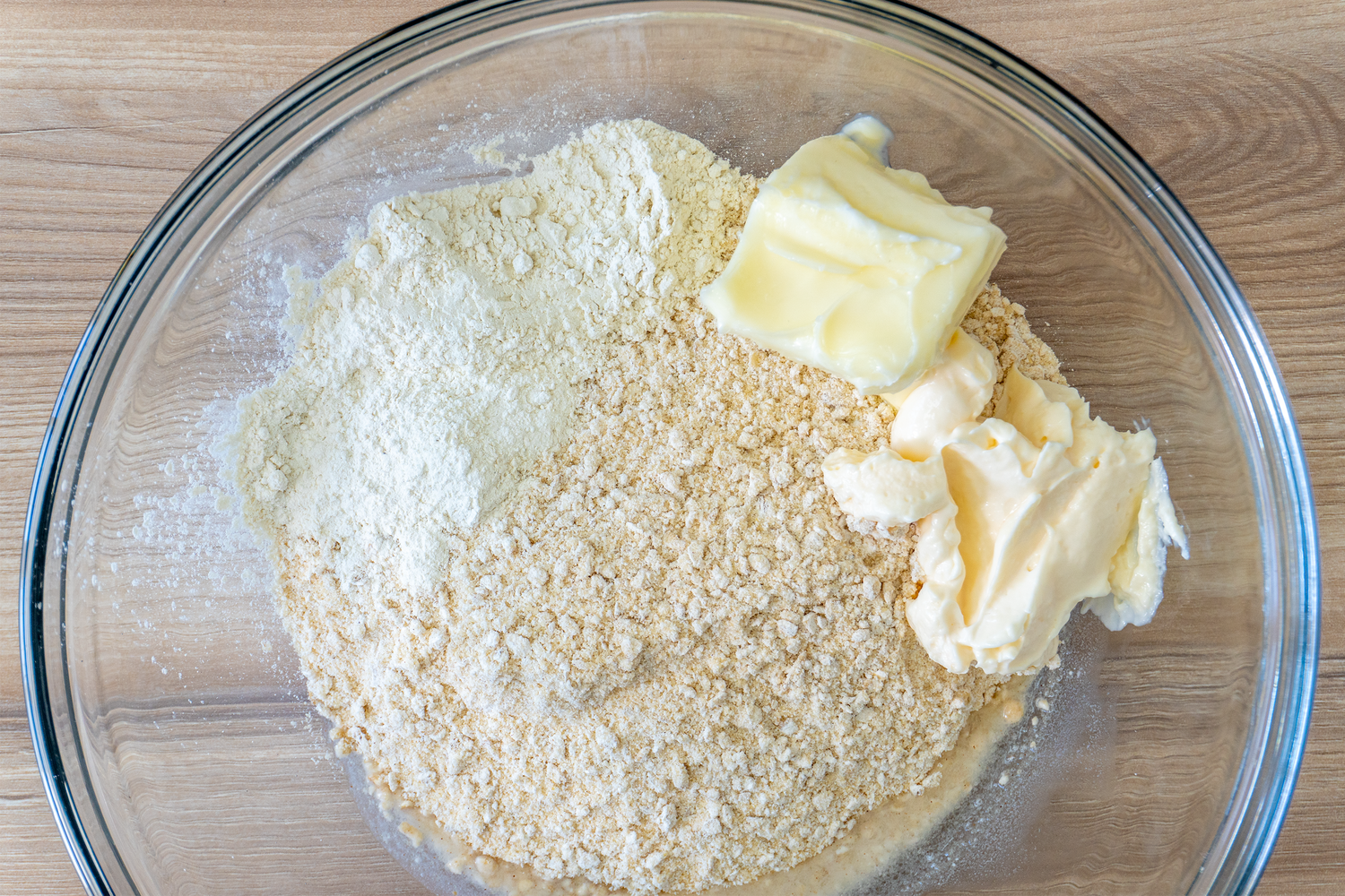 In a large bowl, combine half a package of oatmeal cookie mix, 1 1/2 tablespoons Banana Spruits, 1 1/2 tablespoons mayonnaise (as an egg substitute), 1/4 cup softened butter, and 1 tablespoon water. Stir until the mixture comes together into a dough and all dry ingredients are fully absorbed.