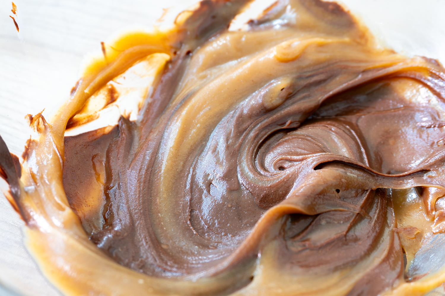 Stir the warmed peanut butter mixture into the melted chocolate until fully combined.