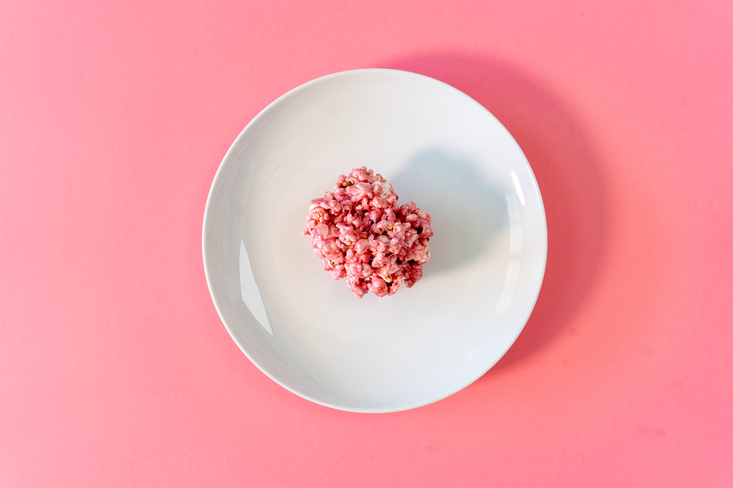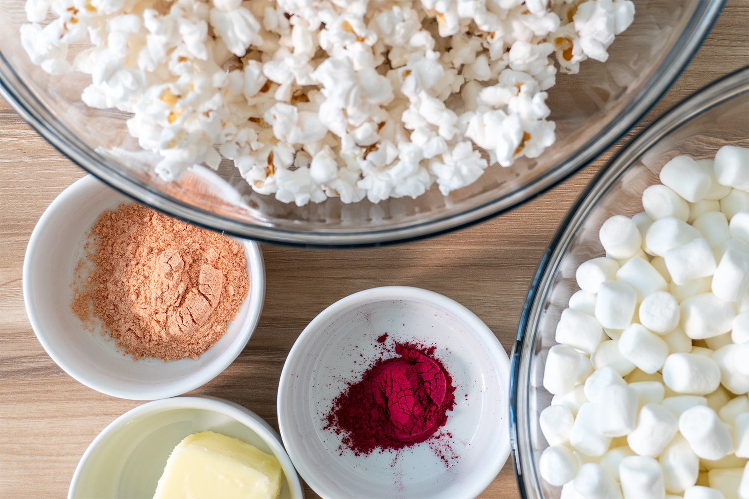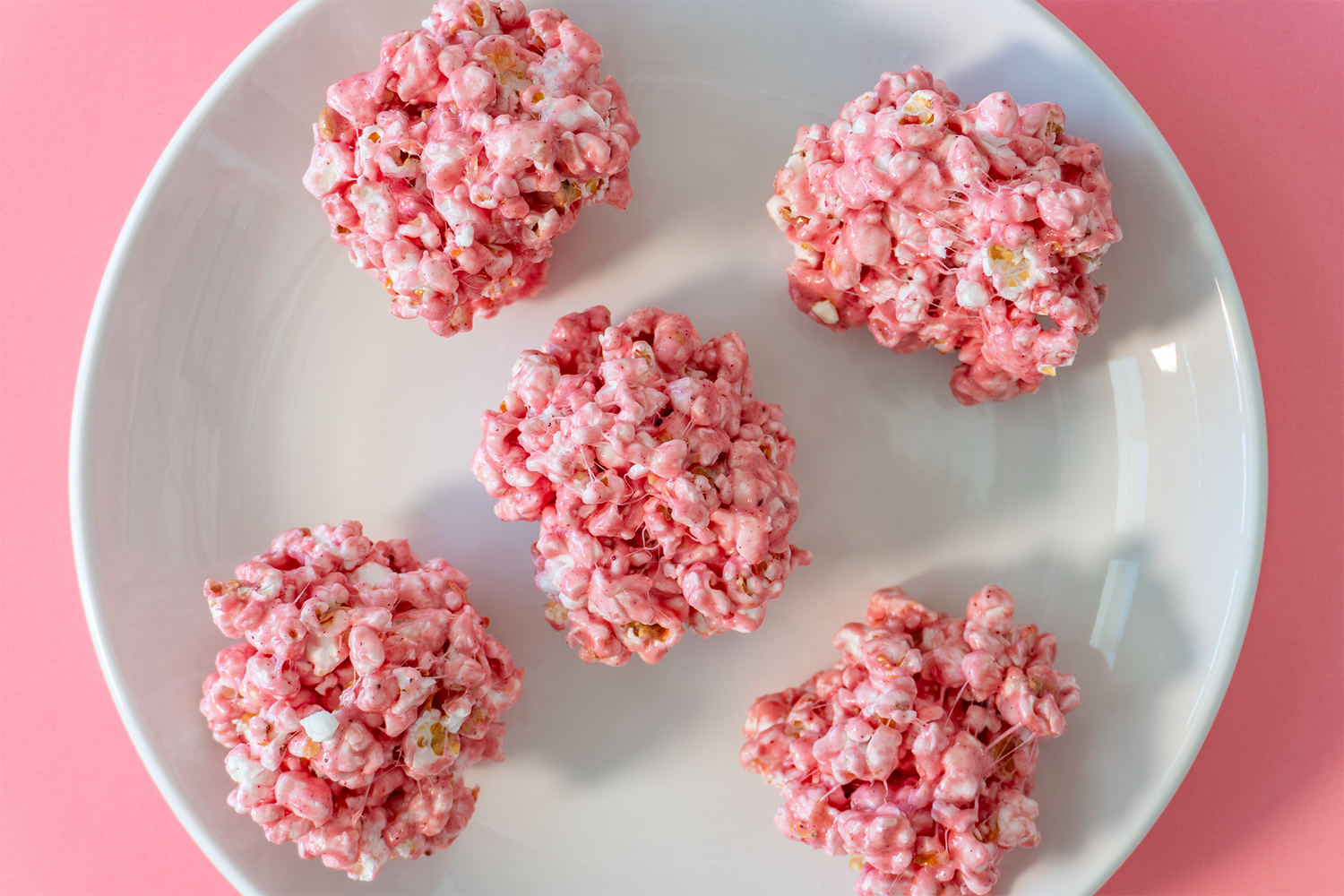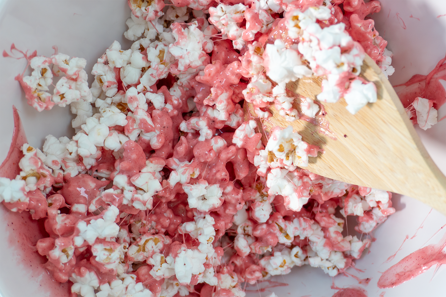 While the marshmallow mixture is still warm, pour it over the popped popcorn. Using a greased spoon, fold the mixture until the pink marshmallow is evenly distributed.