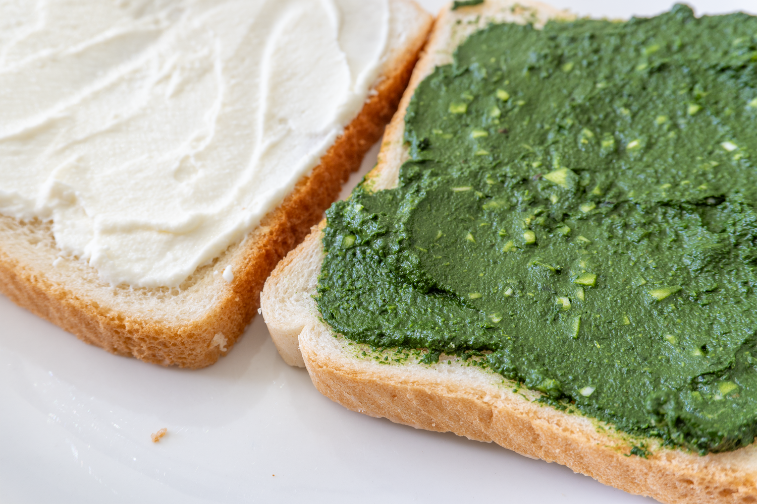 Spread the spinach mixture on the unbrushed side of one slice of bread and sprinkle the bacon over. On the other slice, spread 2 tablespoons of ricotta cheese, then layer white cheddar cheese slices over the top.