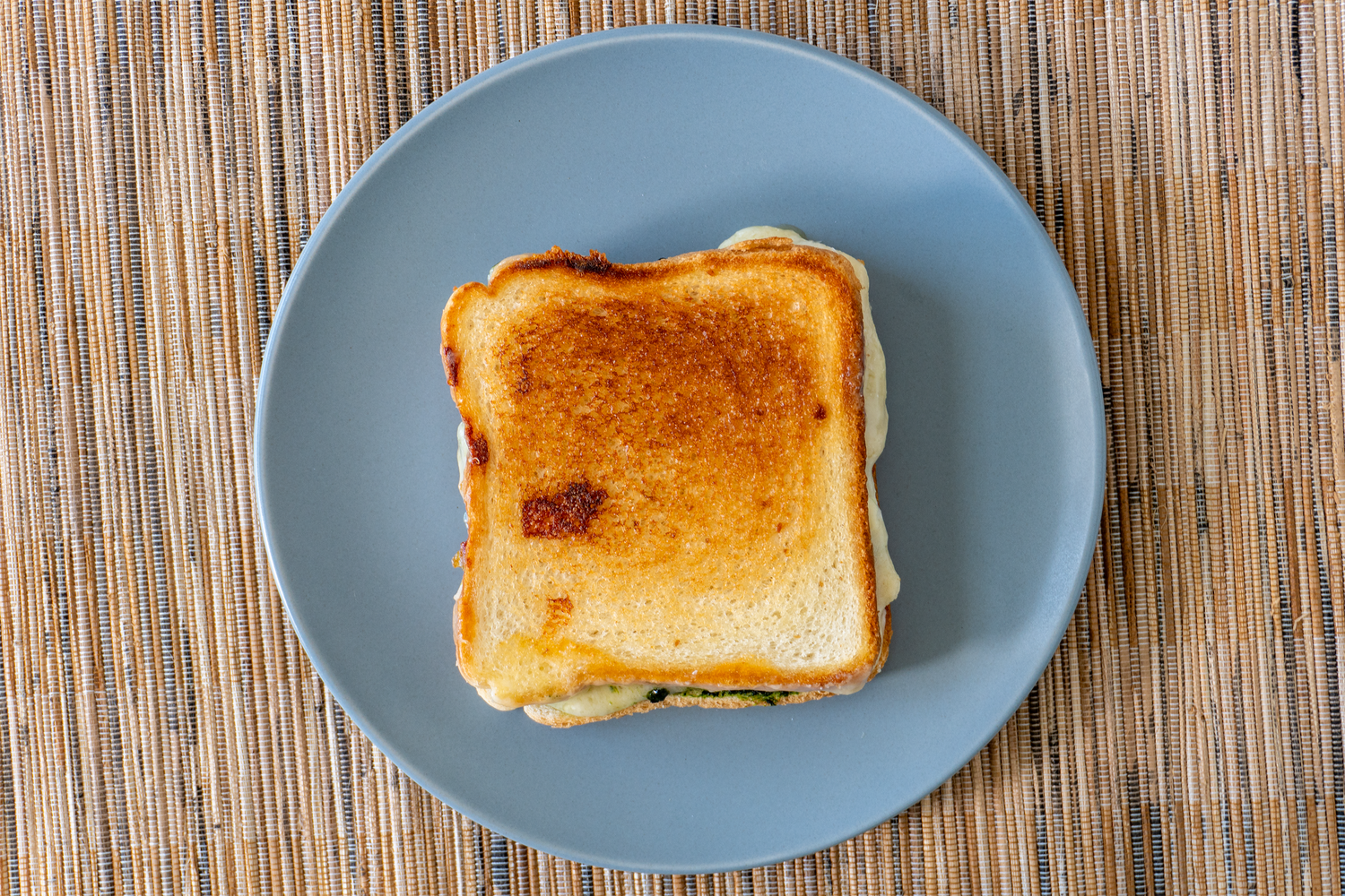 Let the sandwich cool for a minute before slicing. The combination of creamy ricotta, sharp cheddar, and garlicky spinach makes for a grilled cheese that’s both comforting and full of flavor.