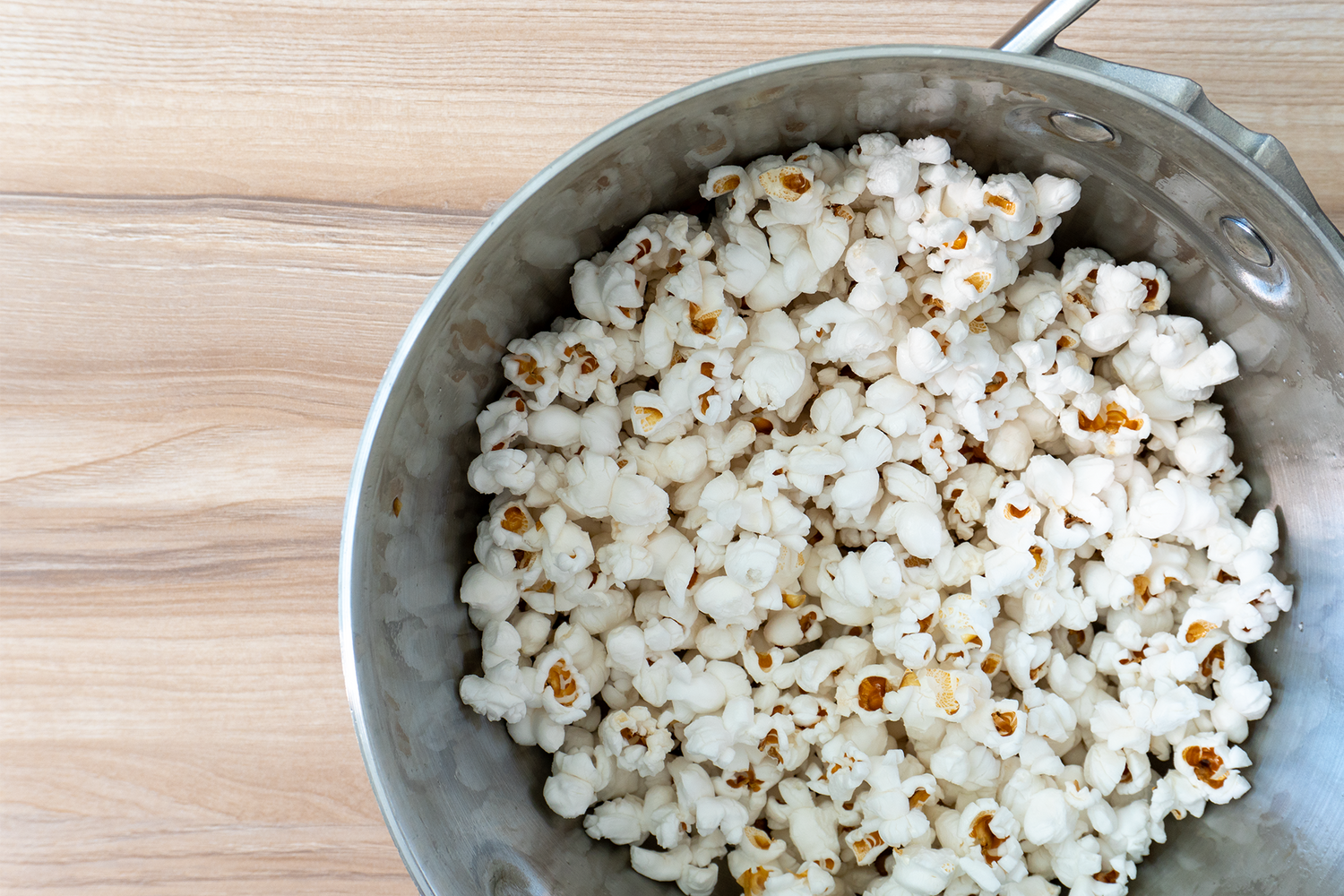 Once the coconut oil is hot, add the popcorn kernels to the pot. Cover with the lid and allow the popcorn to pop, shaking the pot occasionally to prevent burning. When the popping slows to about 4 seconds between pops, remove the pot from the heat.