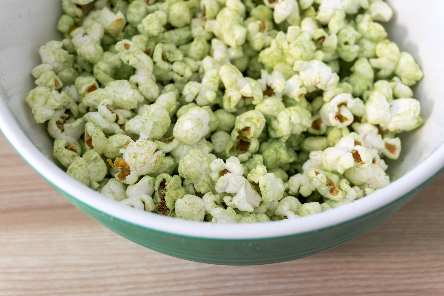 Transfer the freshly popped popcorn to a large container with a secure lid. Sprinkle the cheddar-spinach seasoning mix over the popcorn.