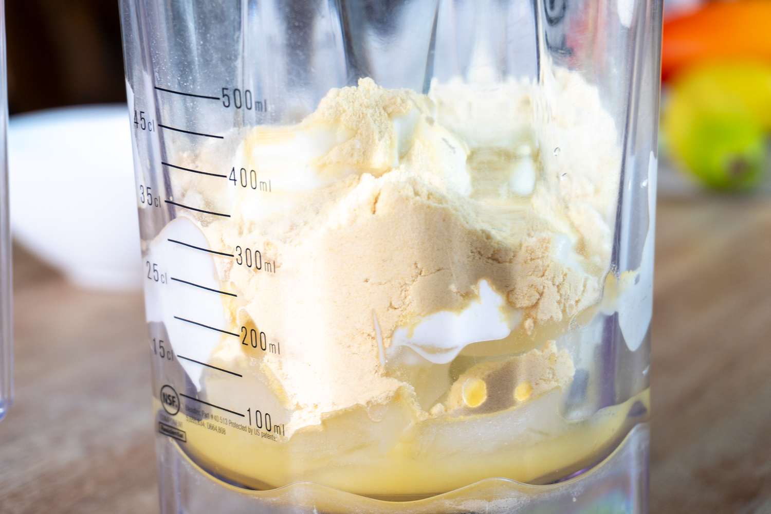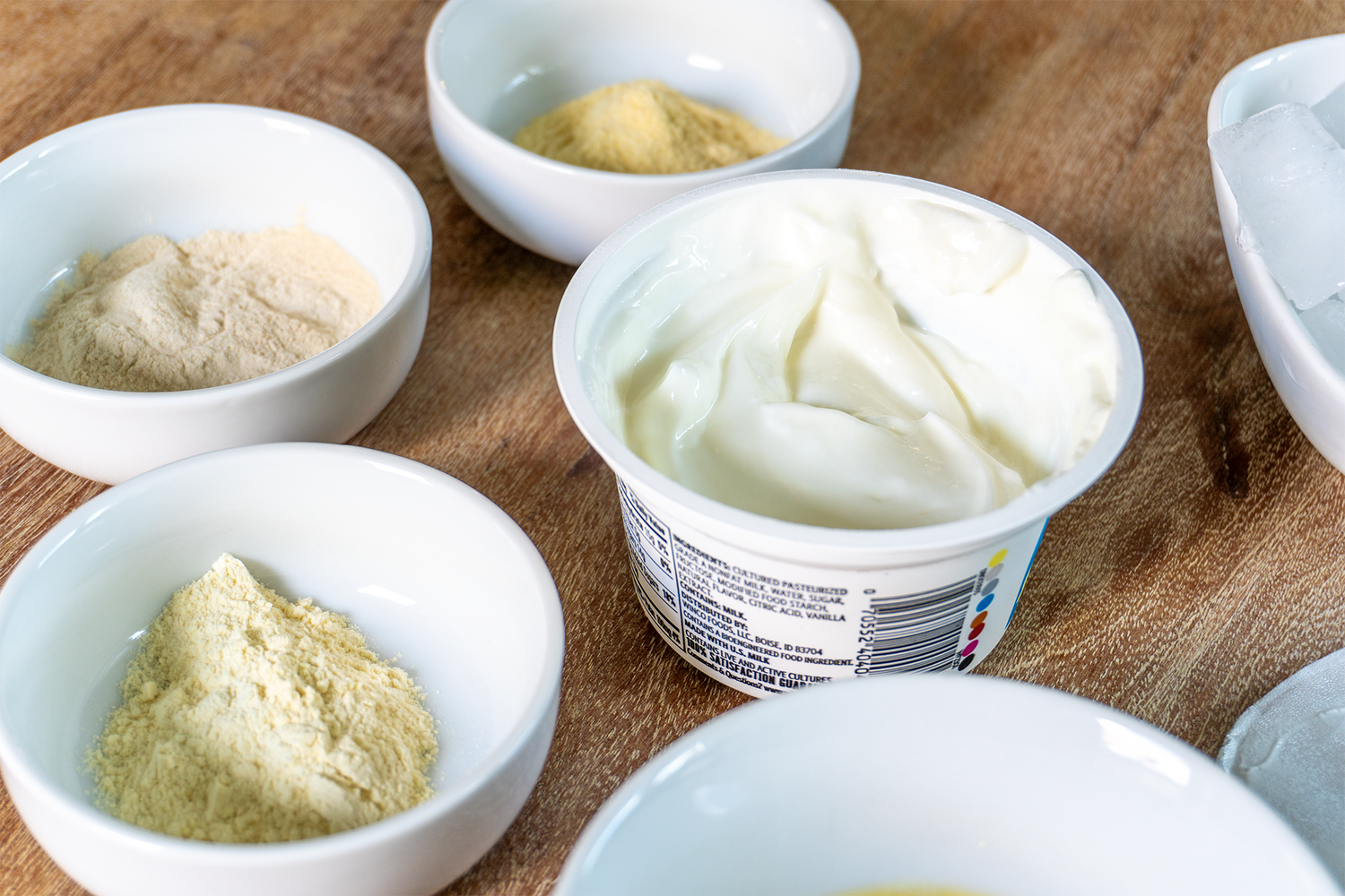 In a blender or juicing jar, combine 1 cup of ice, 1 package (5 oz / 150g) vanilla Greek yogurt, 2 tablespoons orange juice, 3/4 tablespoon mango Spruits, 3/4 tablespoon banana Spruits, and 3/4 tablespoon pineapple Spruits.